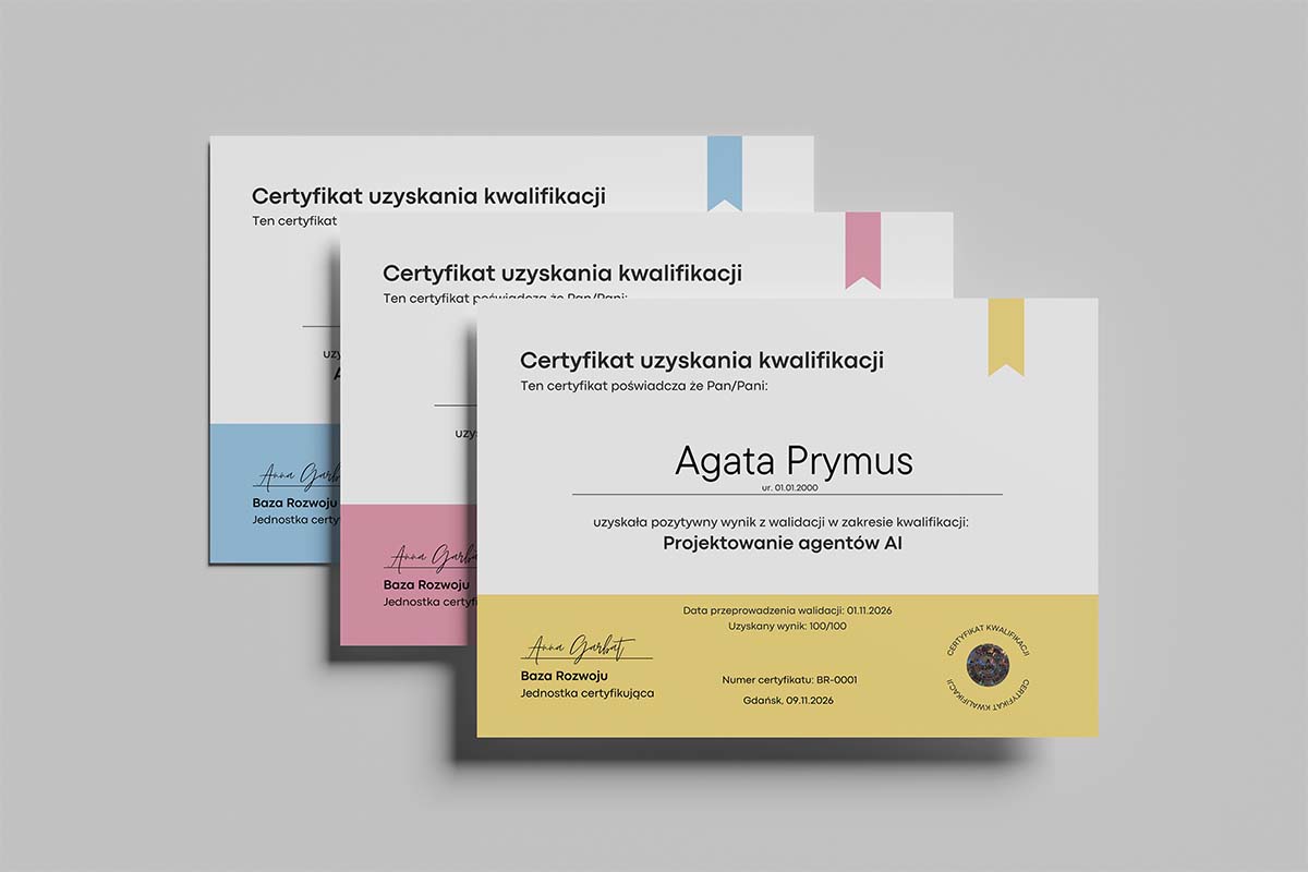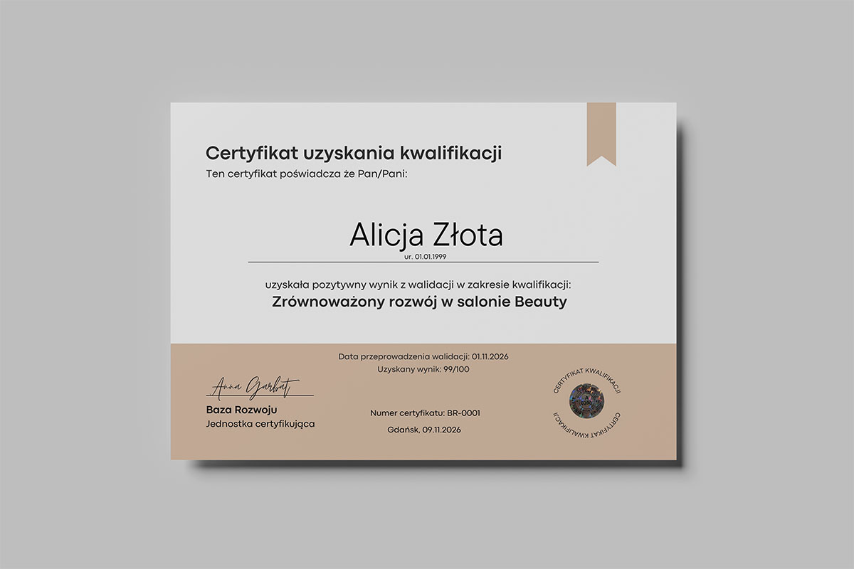Każdy proces certyfikacji kończy się wydaniem Certyfikatu Baza Rozwoju – dokumentu potwierdzającego osiągnięcie określonych efektów uczenia się i zgodność kwalifikacji z wymaganiami operatora i instytucji finansującej.